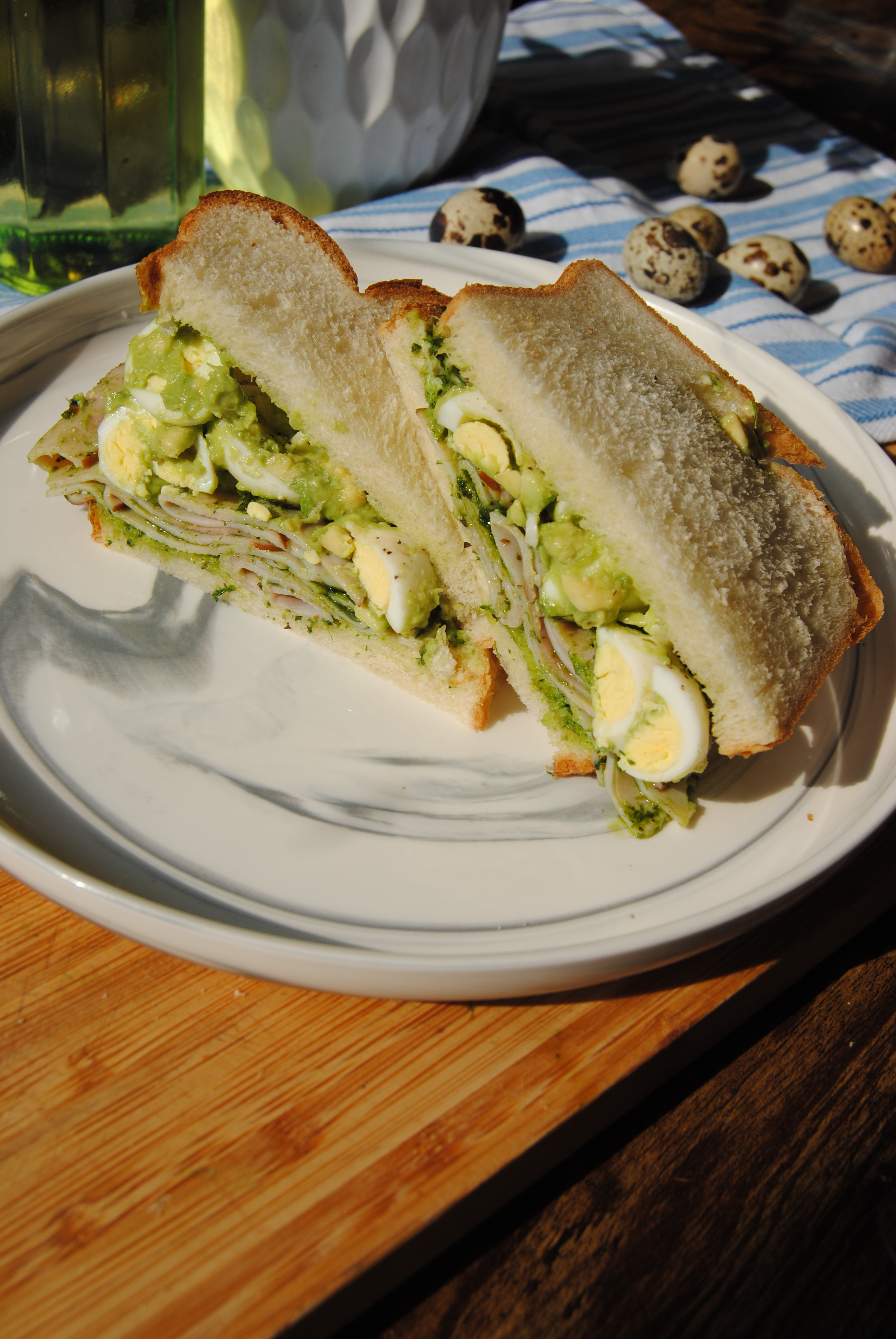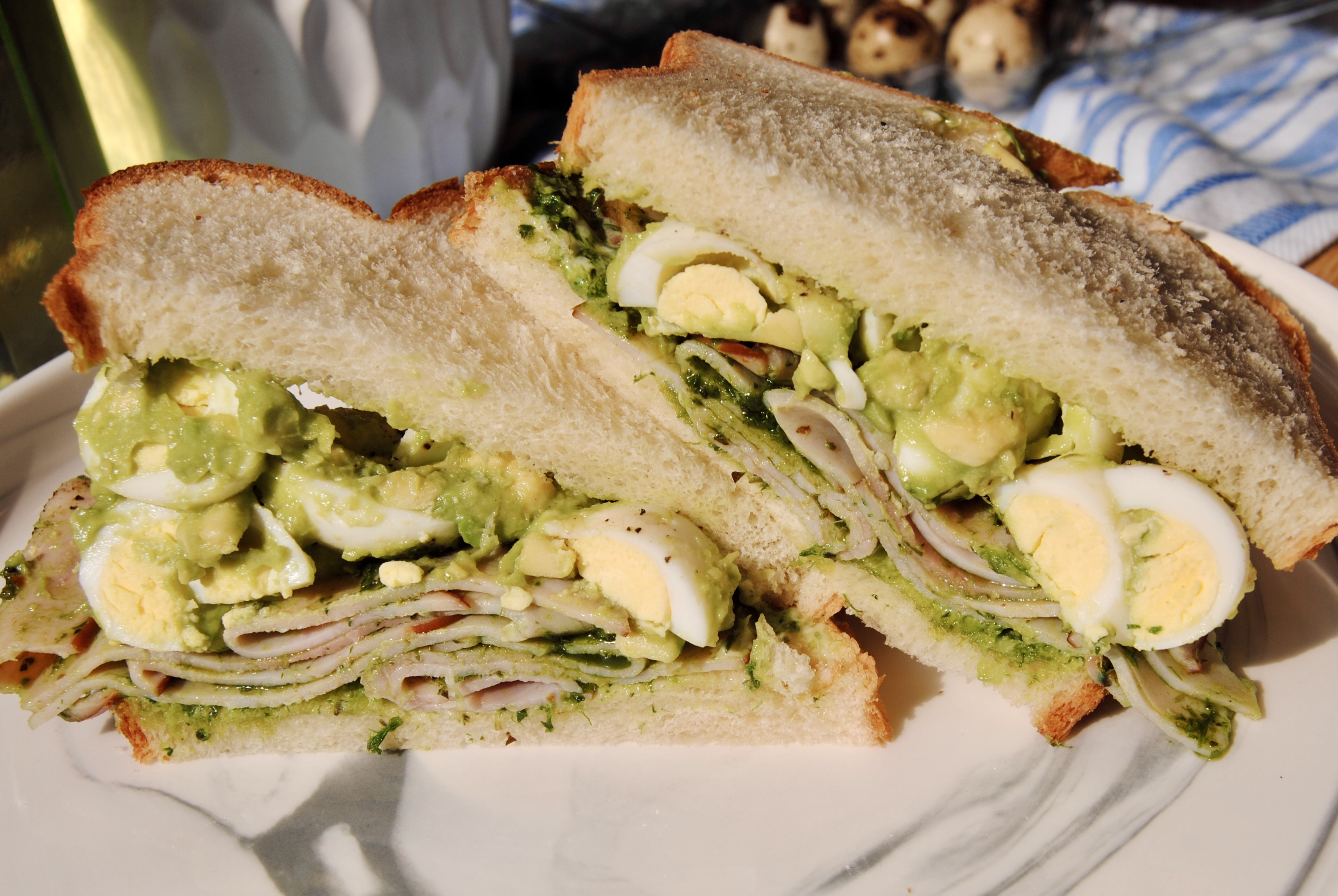 Layer quail egg–avocado mixture and pesto-coated ham between slices of bread.