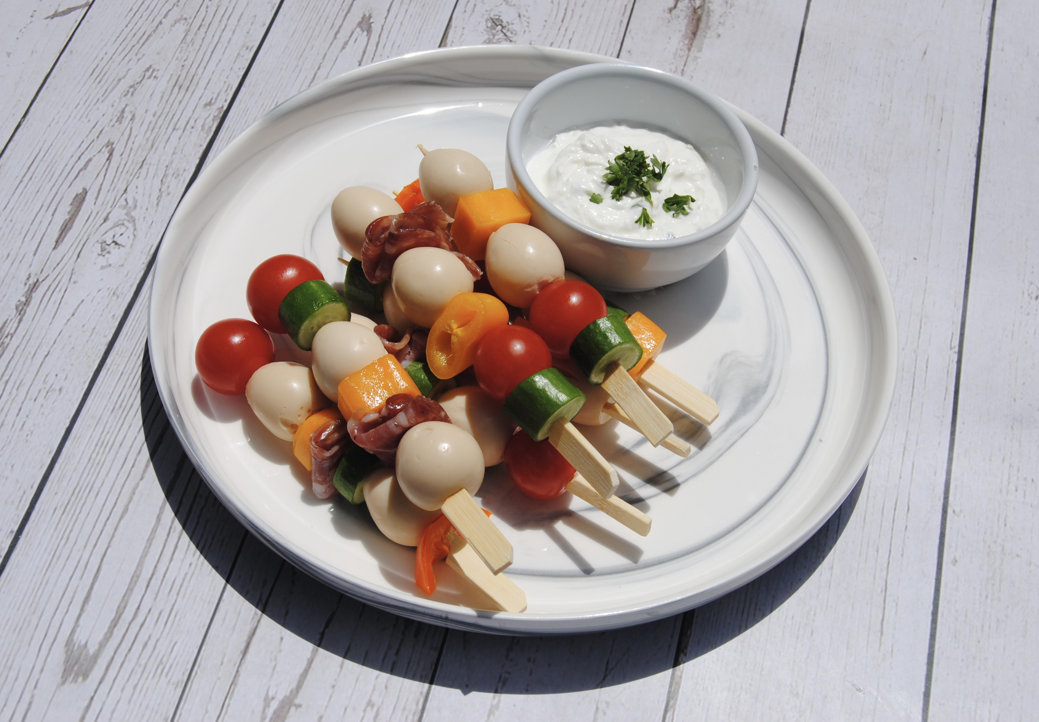 Simply thread skewers with any combination of veggies, cheese, meat, and Spring Creek Pickled quail eggs. No cooking required!