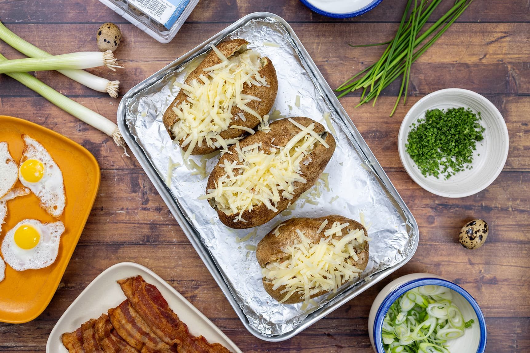 Jacket Potato, Tater Boat, Loaded Potato – whatever you call them at home, you can be sure they'll be an instant crowd pleaser. Loaded with savoury cheese, crispy bacon, the bright zing of scallions, and of course a perfectly fried-but-still-soft quail egg. Add these Double Baked Potatoes to your dinner rotation for a satisfying and filling main or side!
