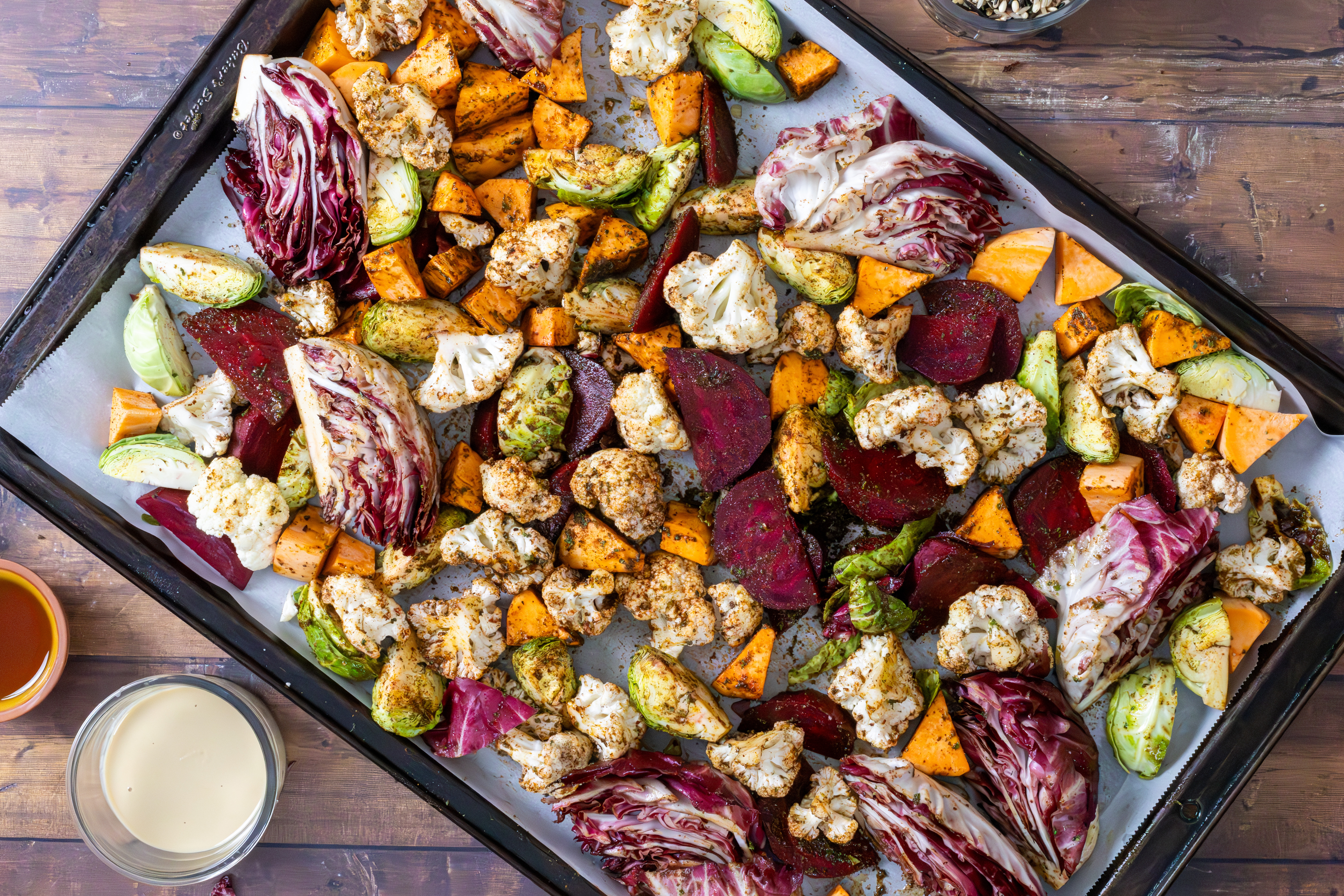 Place all the chopped veggies (cauliflower, beets, sweet potato, Brussels sprouts, and radicchio wedges) on a baking tray. Drizzle with olive oil and sprinkle with sumac, paprika, salt, and pepper. Toss to coat evenly.