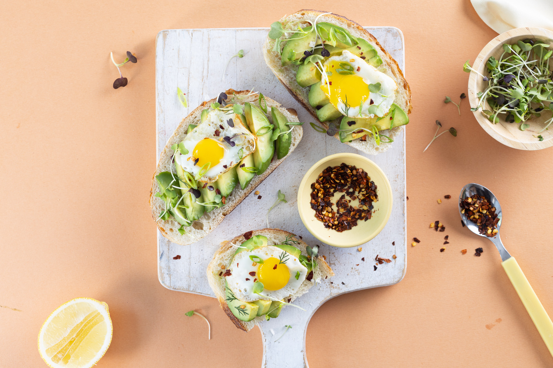 Fry the eggs, sunny-side-up, in a frying pan. Place on top of the avocado toast. If you prefer, scrambled eggs or boiled, peeled and diced eggs also work excellently!