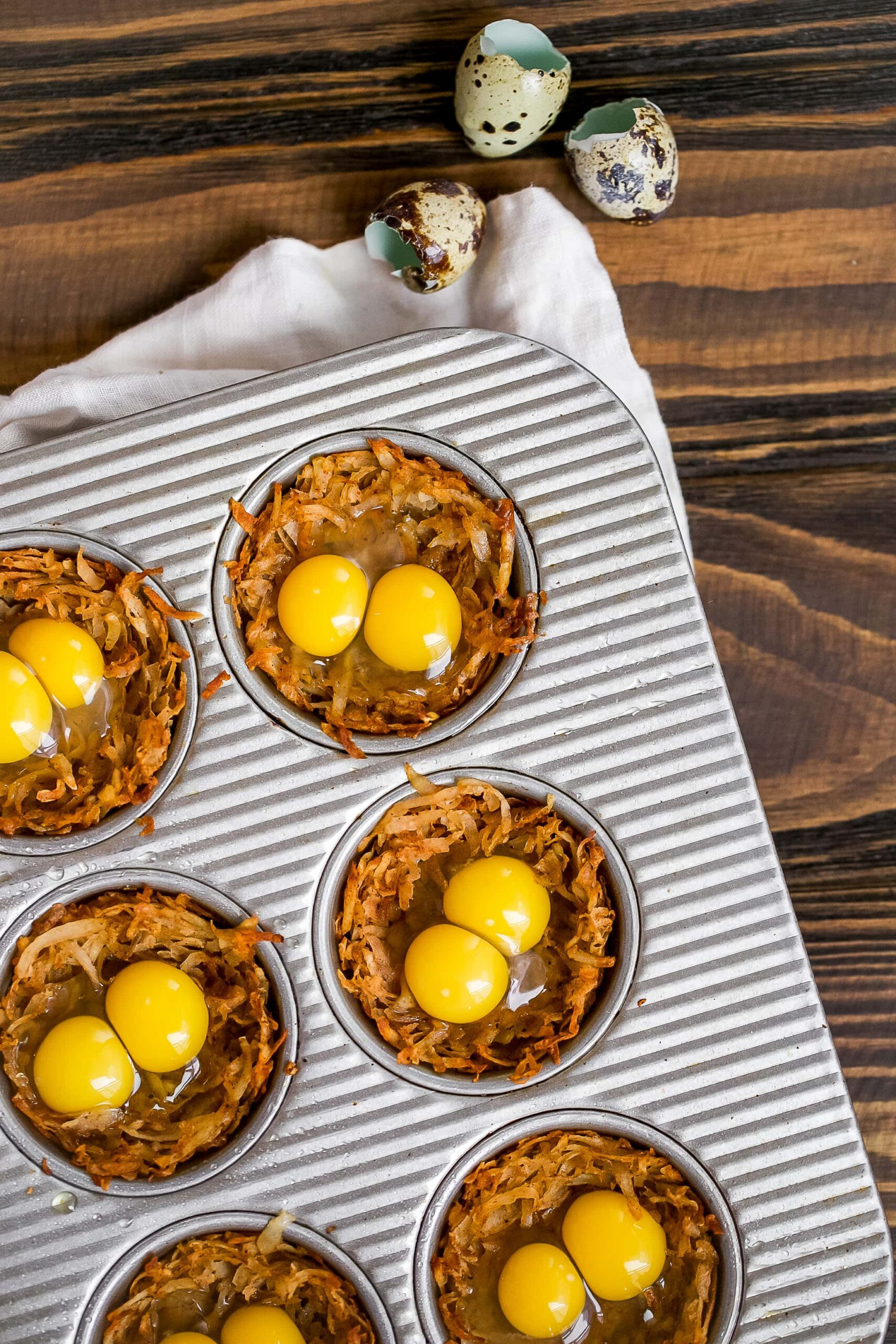 Remove the muffin tin from the oven. Add a small bit of the crumbled chorizo to the egg nests. Use a serrated knife to crack open the quail eggs and add these to the potato nests. Place back in the oven to bake for 8 to 10 minutes, until the whites are set and the yolks are still a little runny.