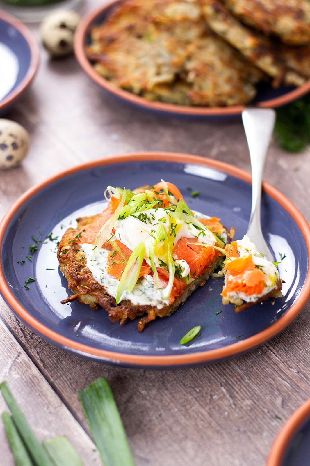 Divide latkes onto plates, top with lemon dill creme fraiche, smoked salmon and quail eggs.