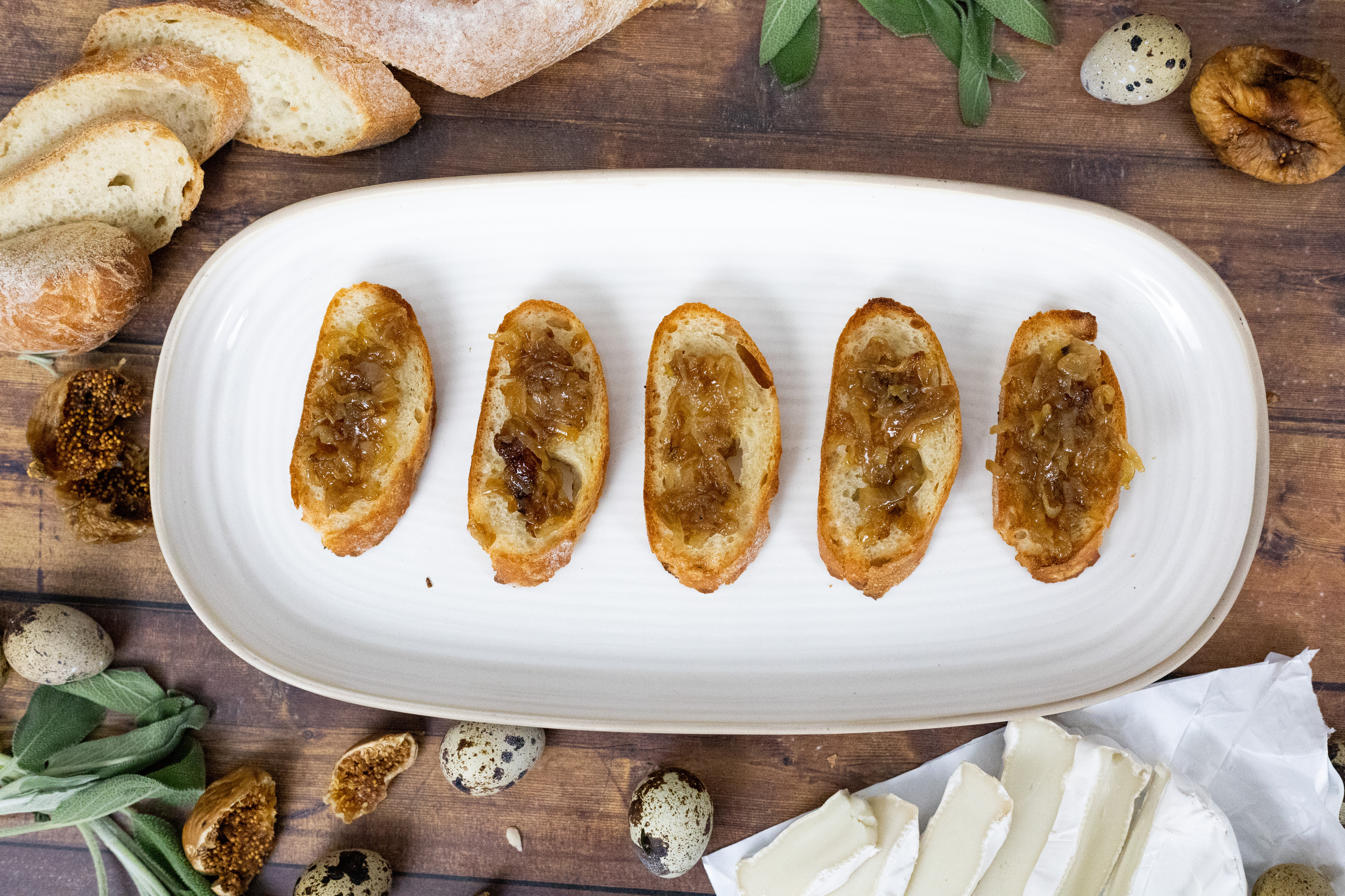 Caramelized Onion and Fig Crostini With Jammy Quail Eggs