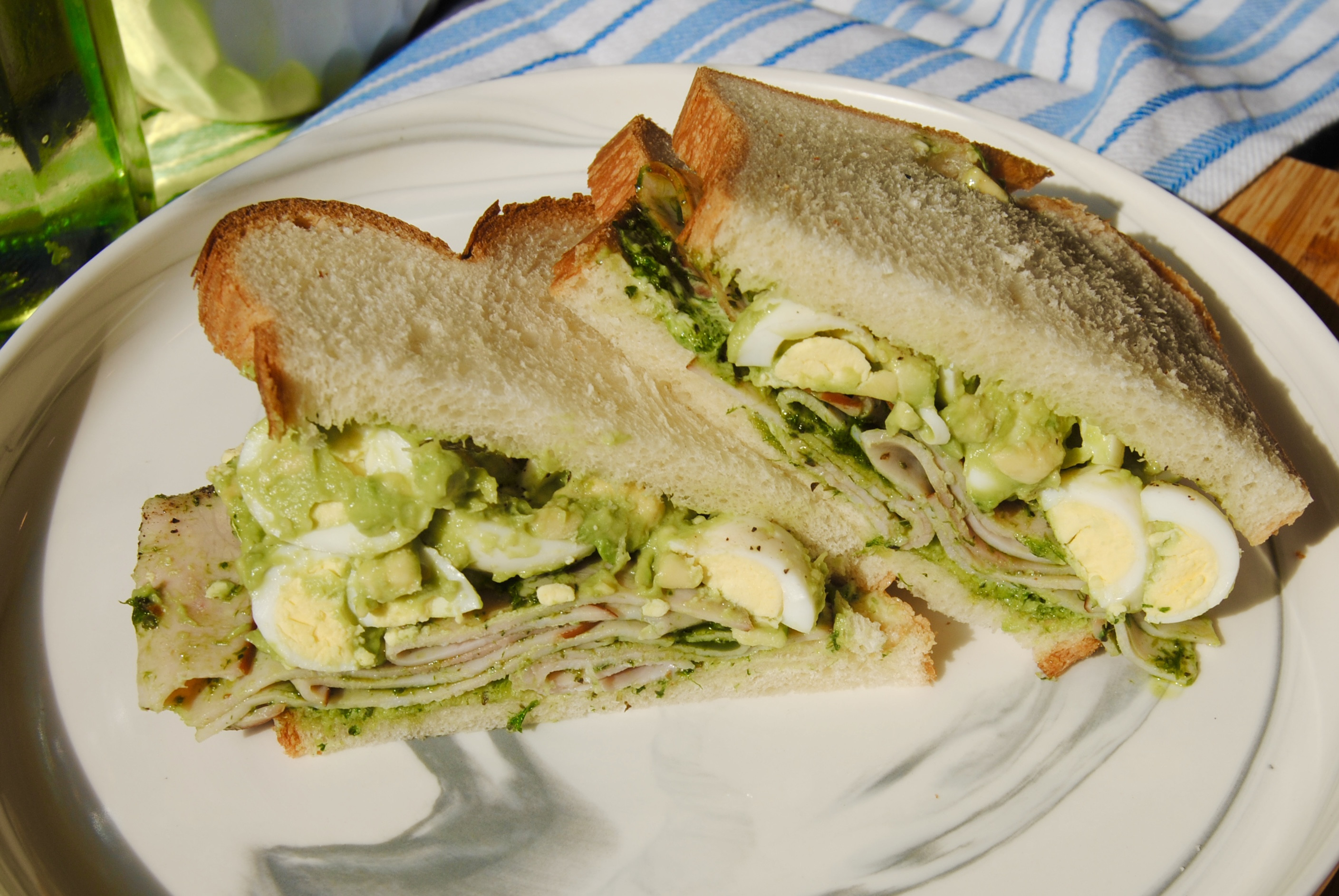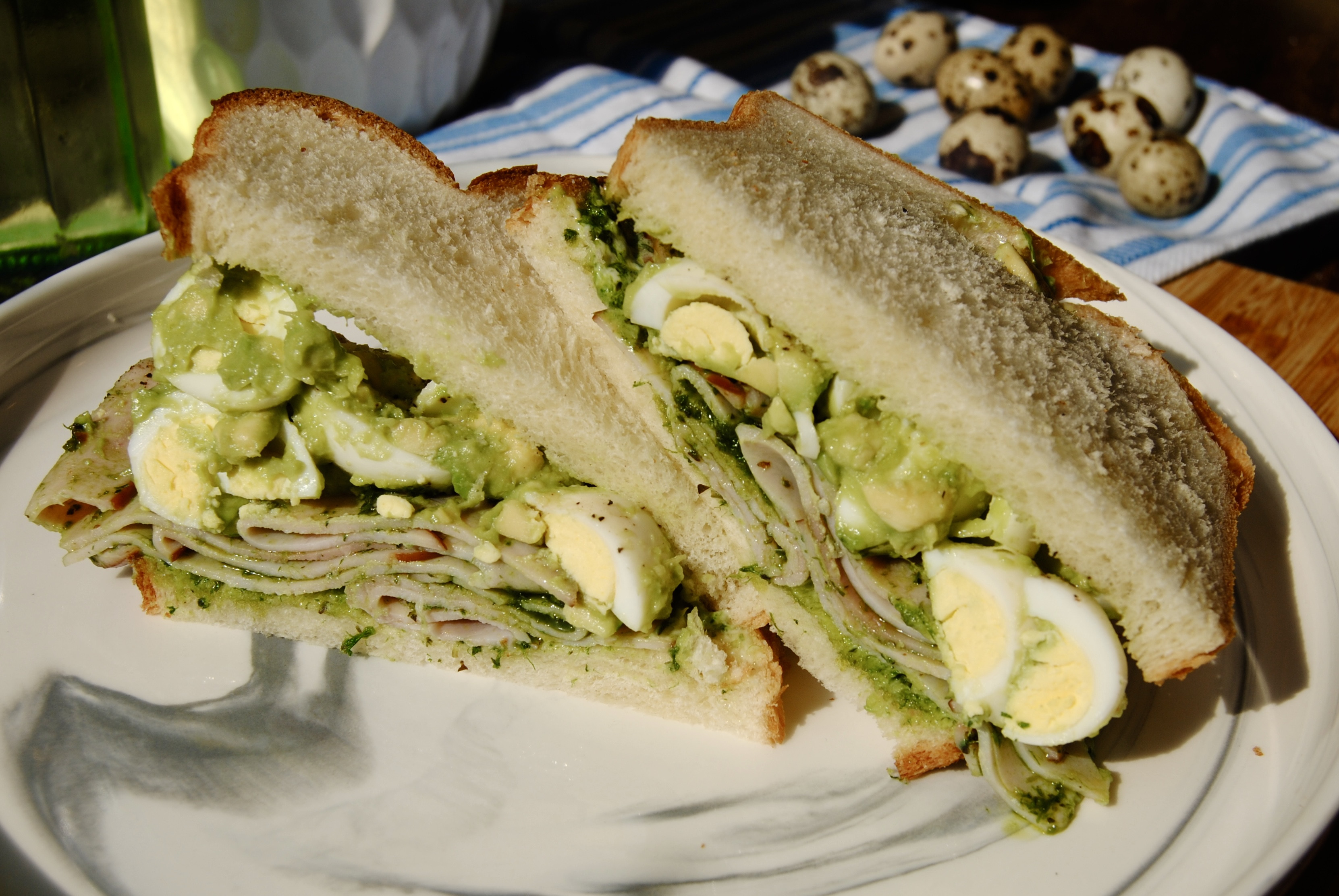 Layer quail egg–avocado mixture and pesto-coated ham between slices of bread.
