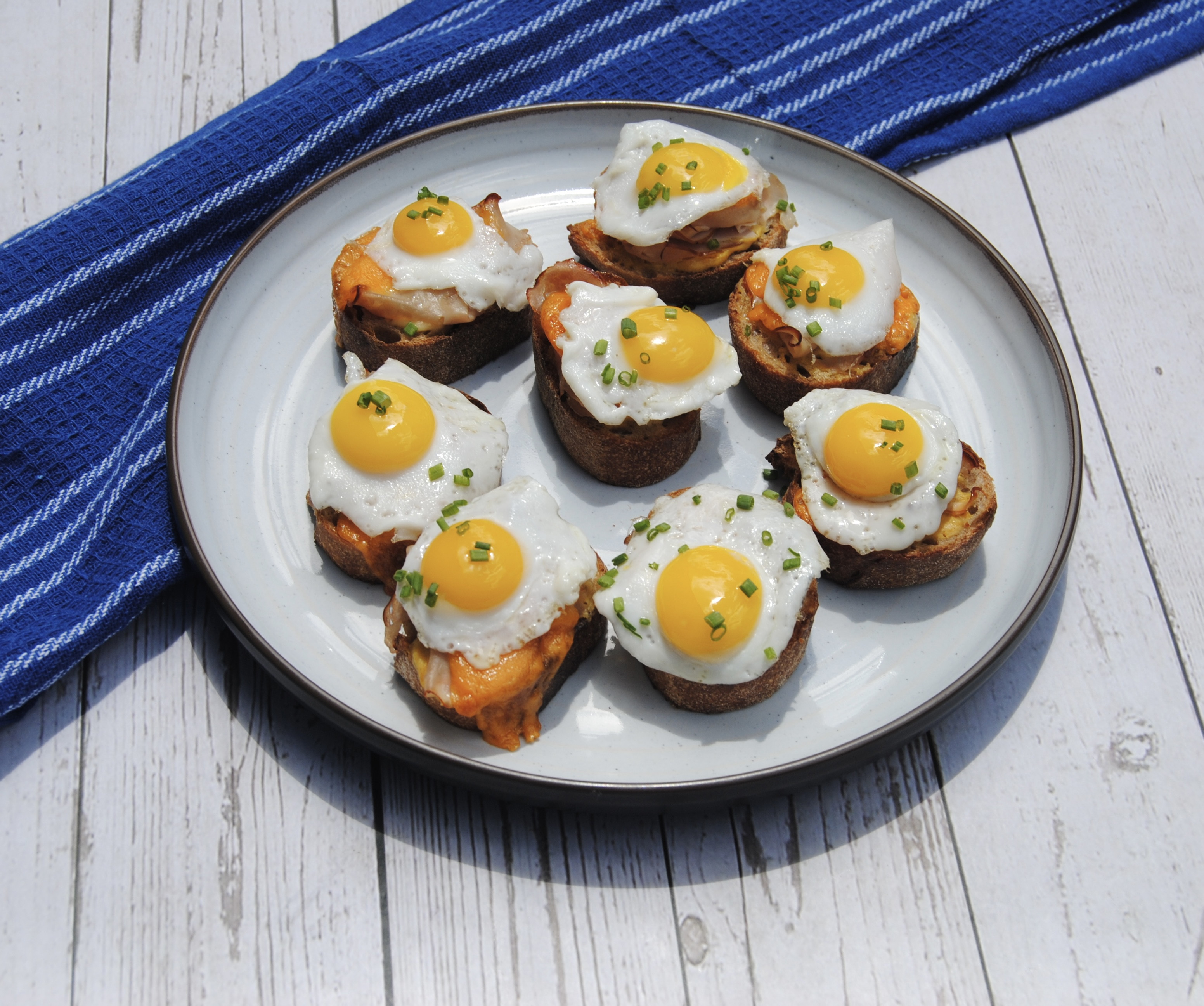 Brunch just got a fun little upgrade. These ham, cheese, and quail egg bagel bites are a playful twist on a classic combo—melty, savoury, and topped with sunny-side-up Spring Creek quail eggs. Chef Kyle Crawford keeps things simple and satisfying, making this the perfect bring-along for your next brunch spread.