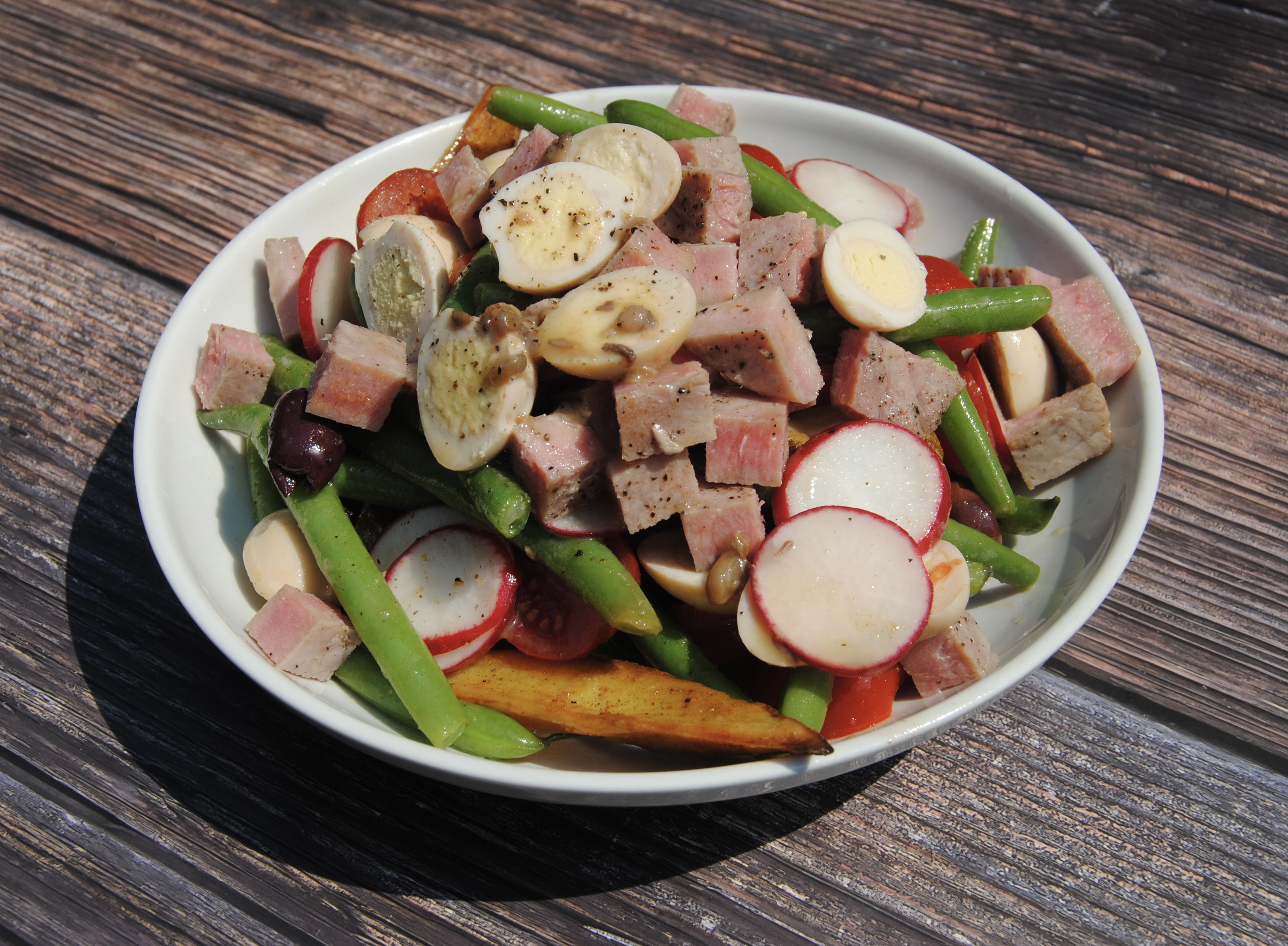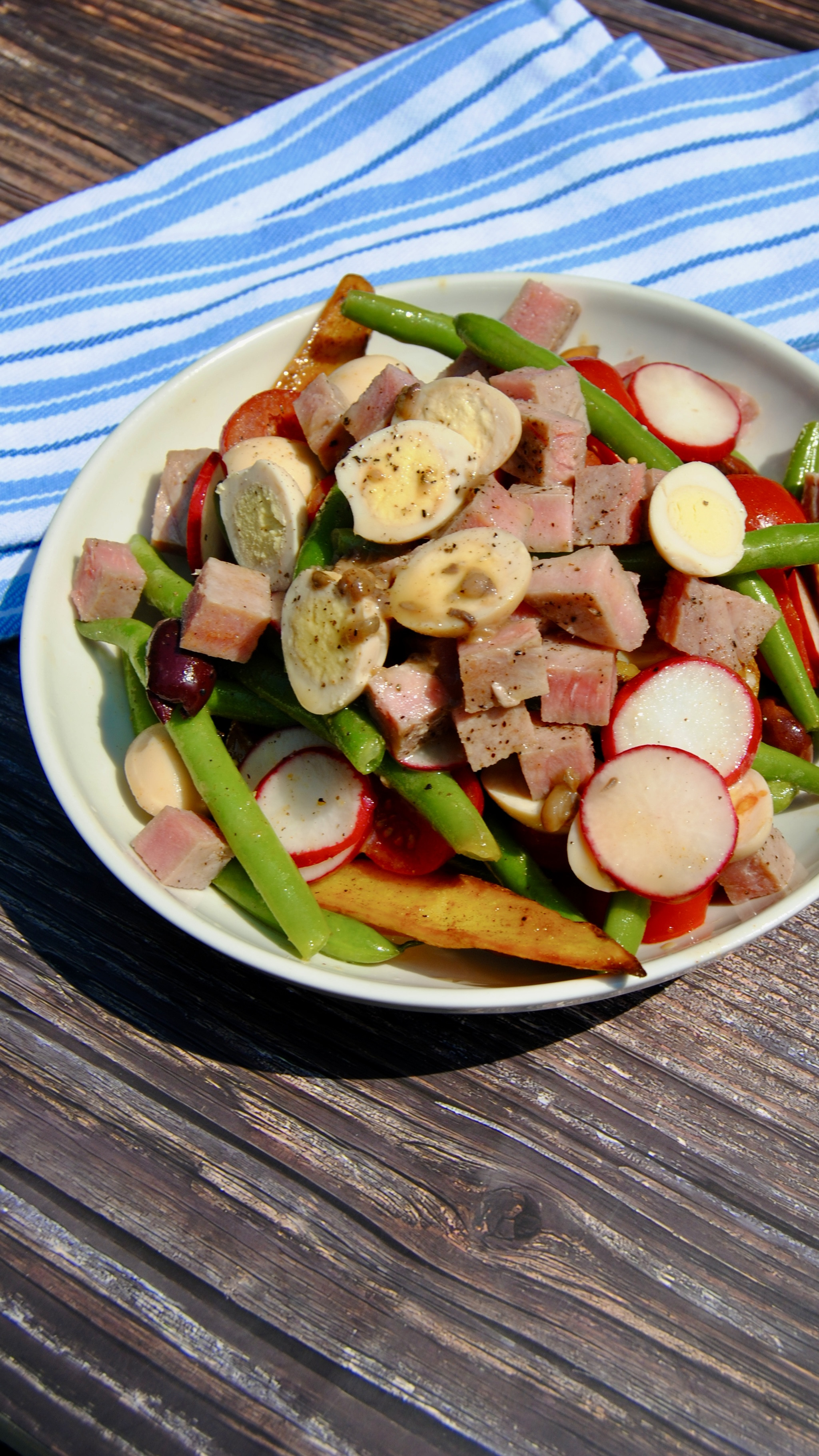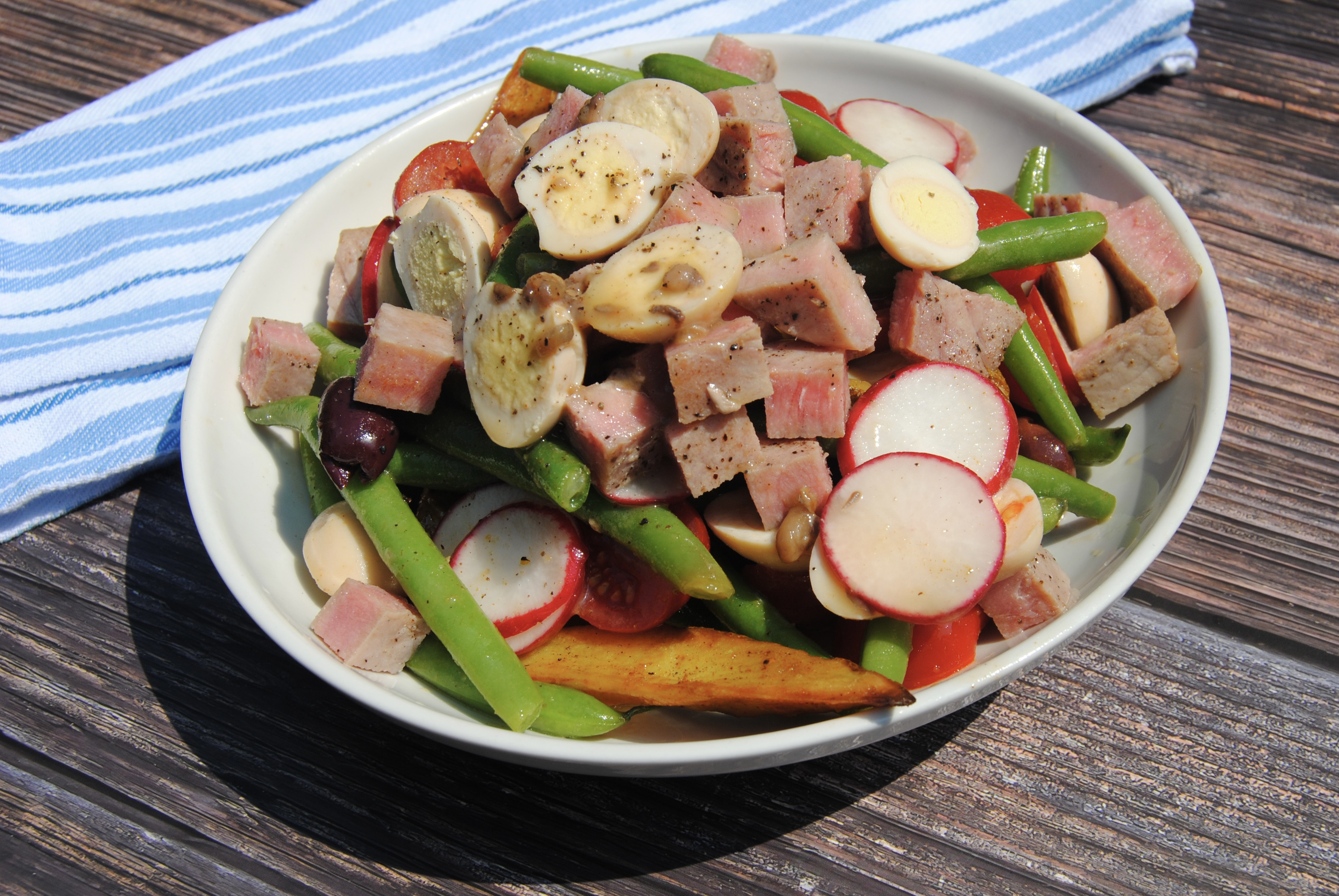 Arrange potato wedges, green beans, cherry tomatoes, radishes, olives, quail eggs, and tuna on a platter or in individual bowls.