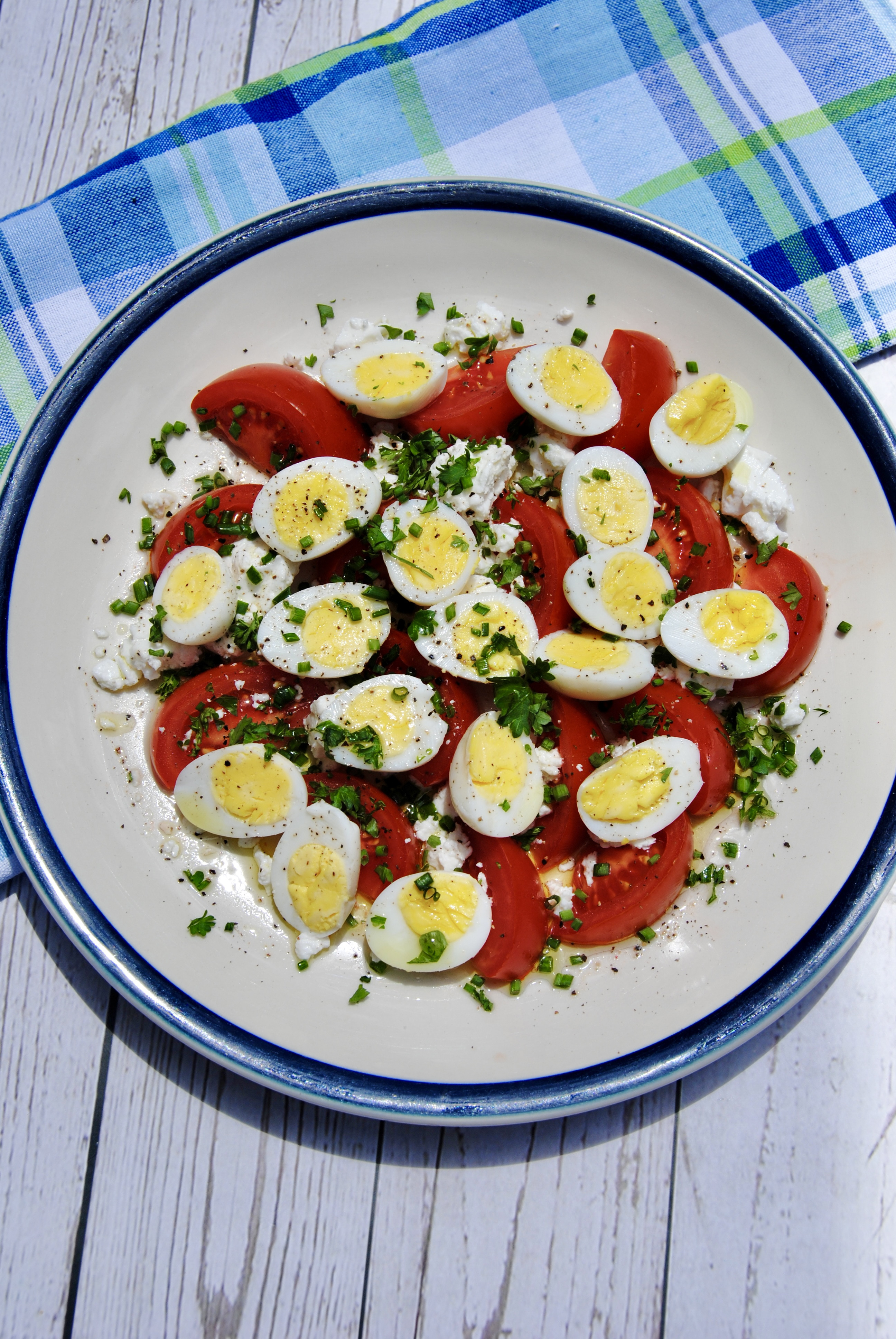 Plate the tomatoes and quail eggs together. Top with feta, chives, parsley, salt, pepper, and a drizzle of olive oil. Enjoy!