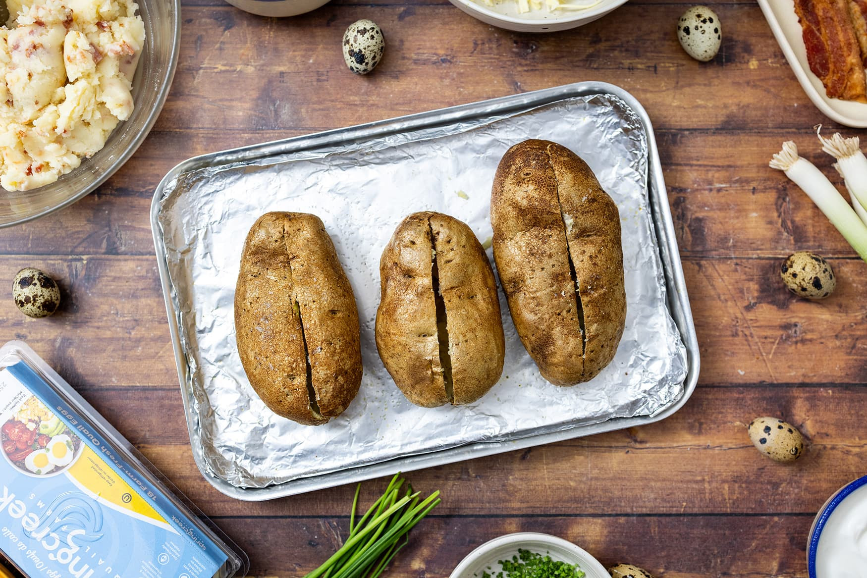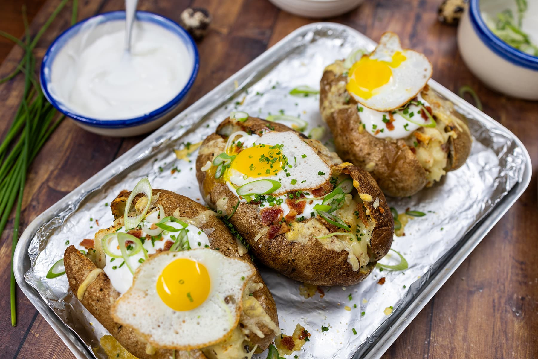 Jacket Potato, Tater Boat, Loaded Potato – whatever you call them at home, you can be sure they'll be an instant crowd pleaser. Loaded with savoury cheese, crispy bacon, the bright zing of scallions, and of course a perfectly fried-but-still-soft quail egg. Add these Double Baked Potatoes to your dinner rotation for a satisfying and filling main or side!