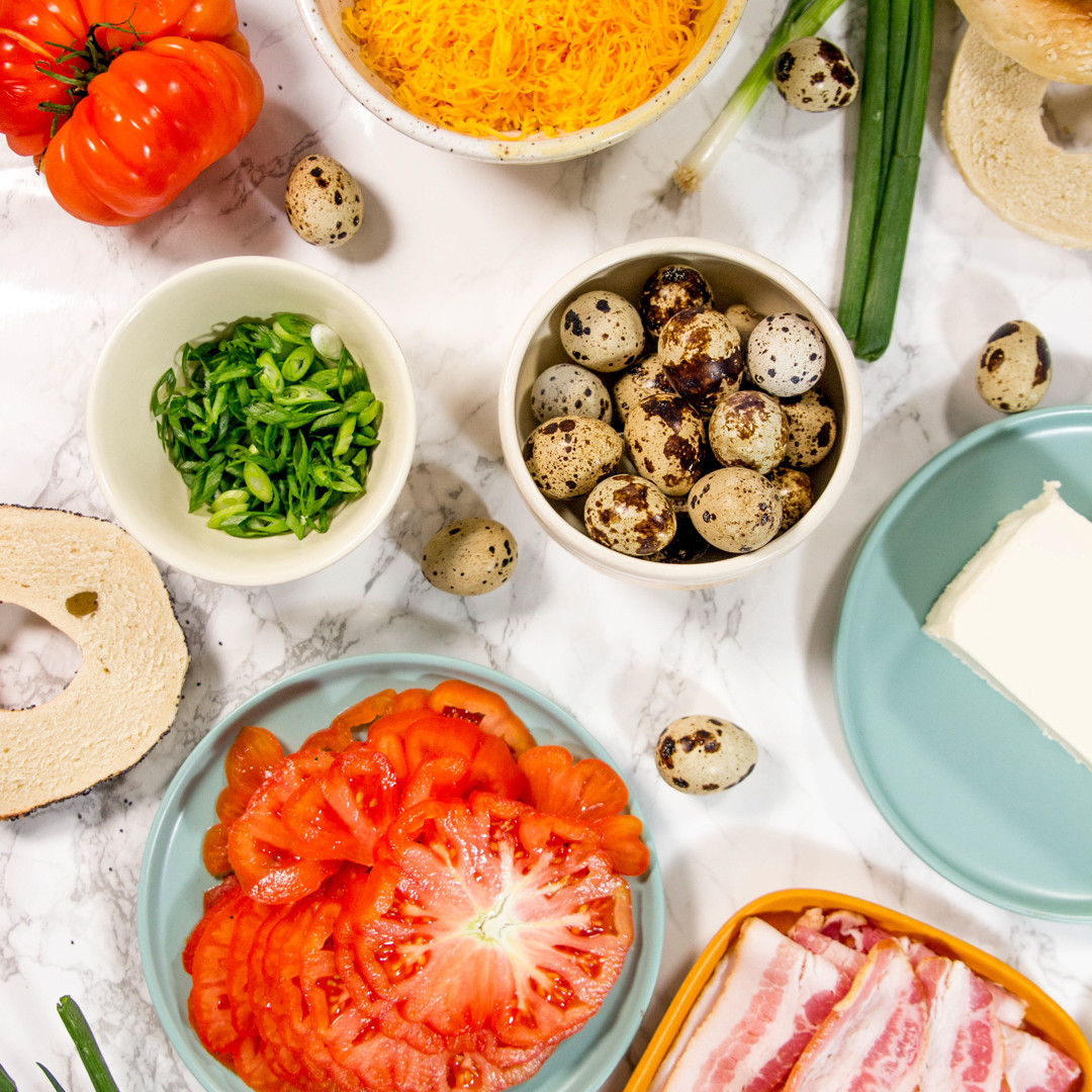 Deceptively simple, this recipe has all the fixings for the ultimate bagel sandwich, New York City style! Load up your bagels with whipped cream cheese, shredded cheddar, fresh tomato, bacon and of course, a healthy helping of scrambled quail eggs.