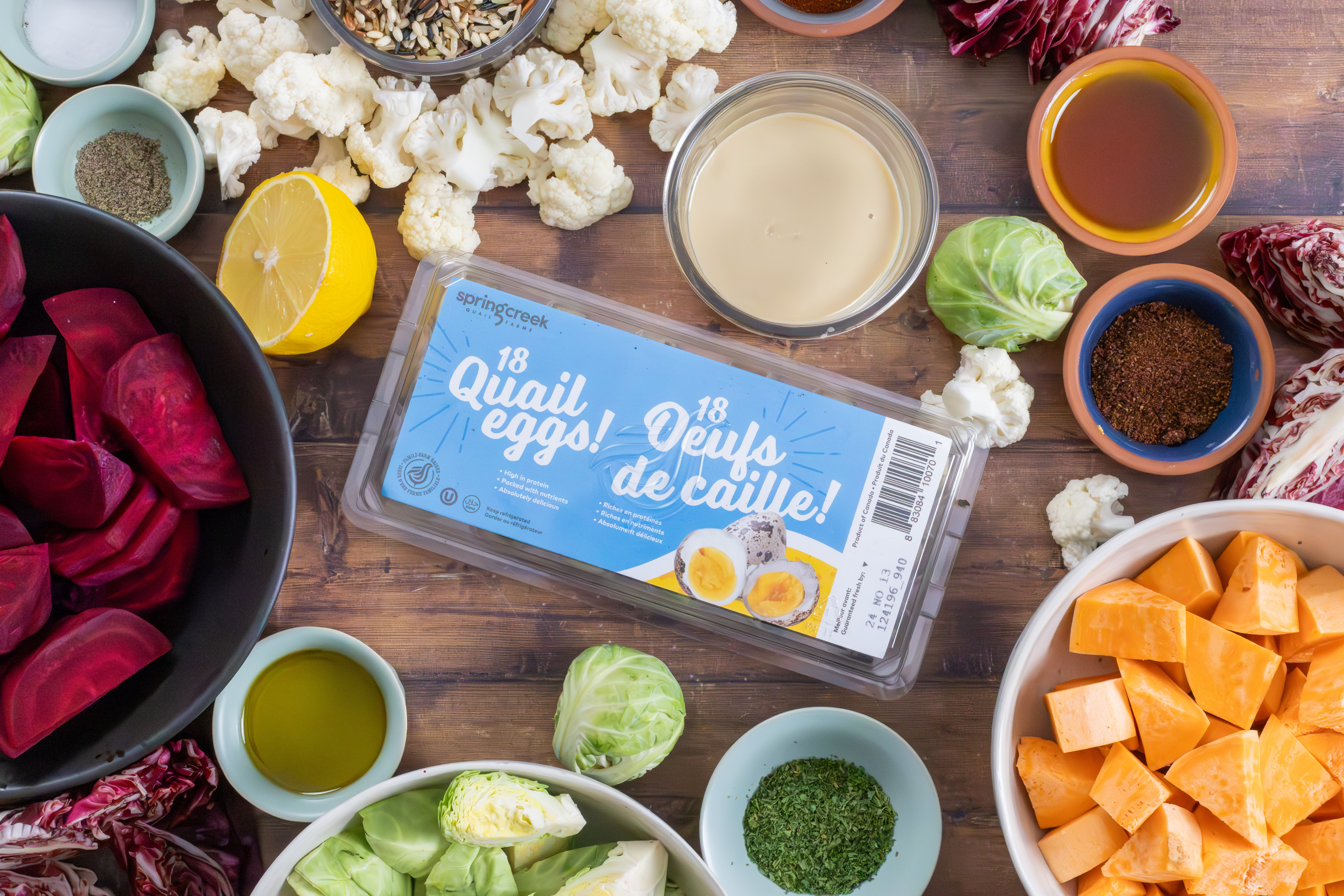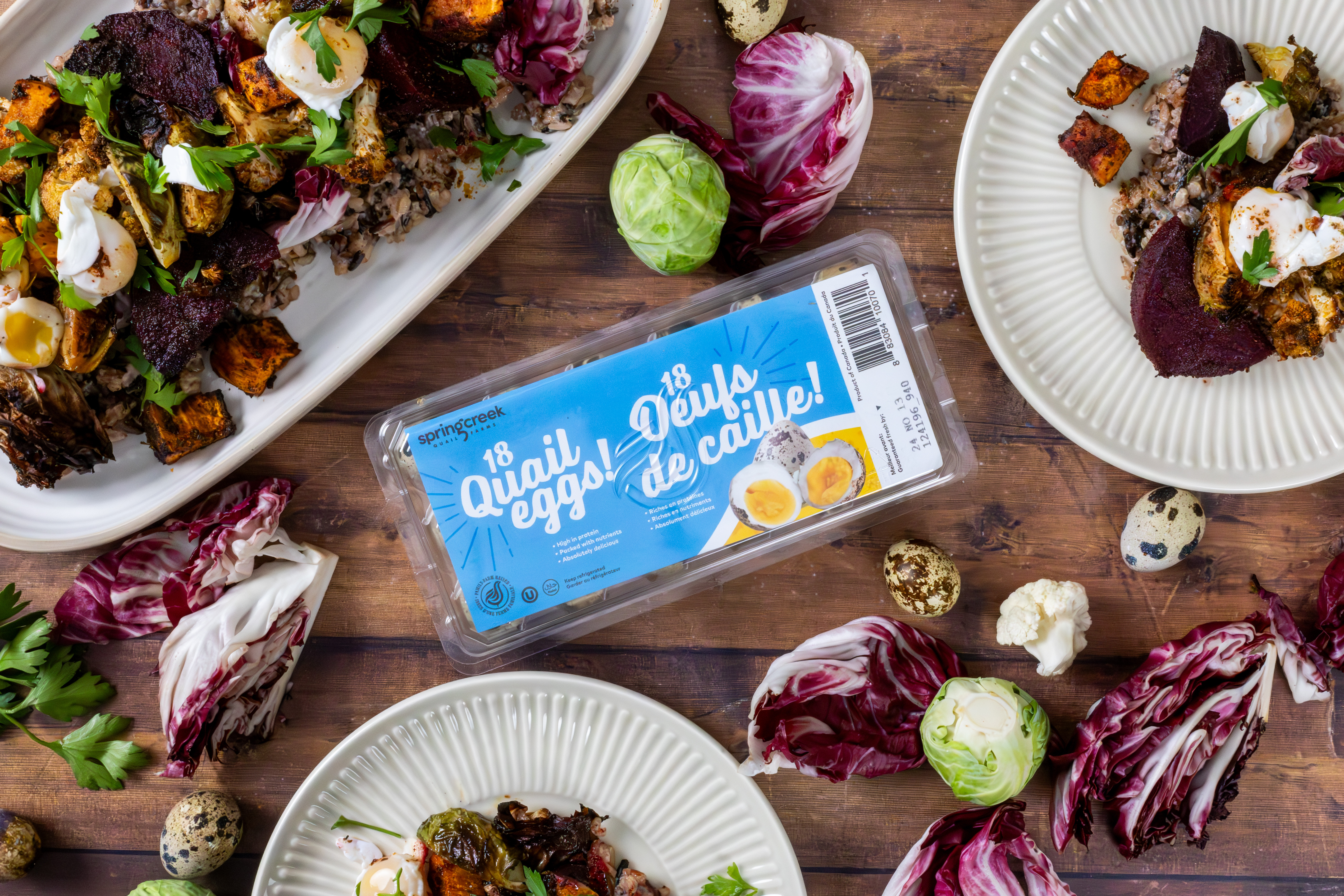 To assemble: Plate the wild rice, top with the roasted vegetables and fresh radicchio wedges. Add the poached quail eggs on top, and finish with a sprinkle of chopped parsley.
