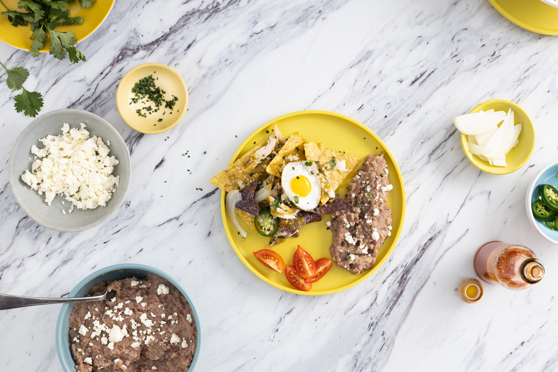 Serve the chilaquiles on a plate, topped with the fried egg. Add a scoop of warm La Costeña refried beans if desired.