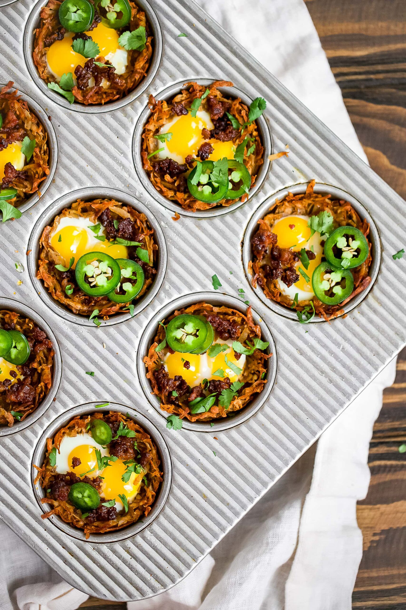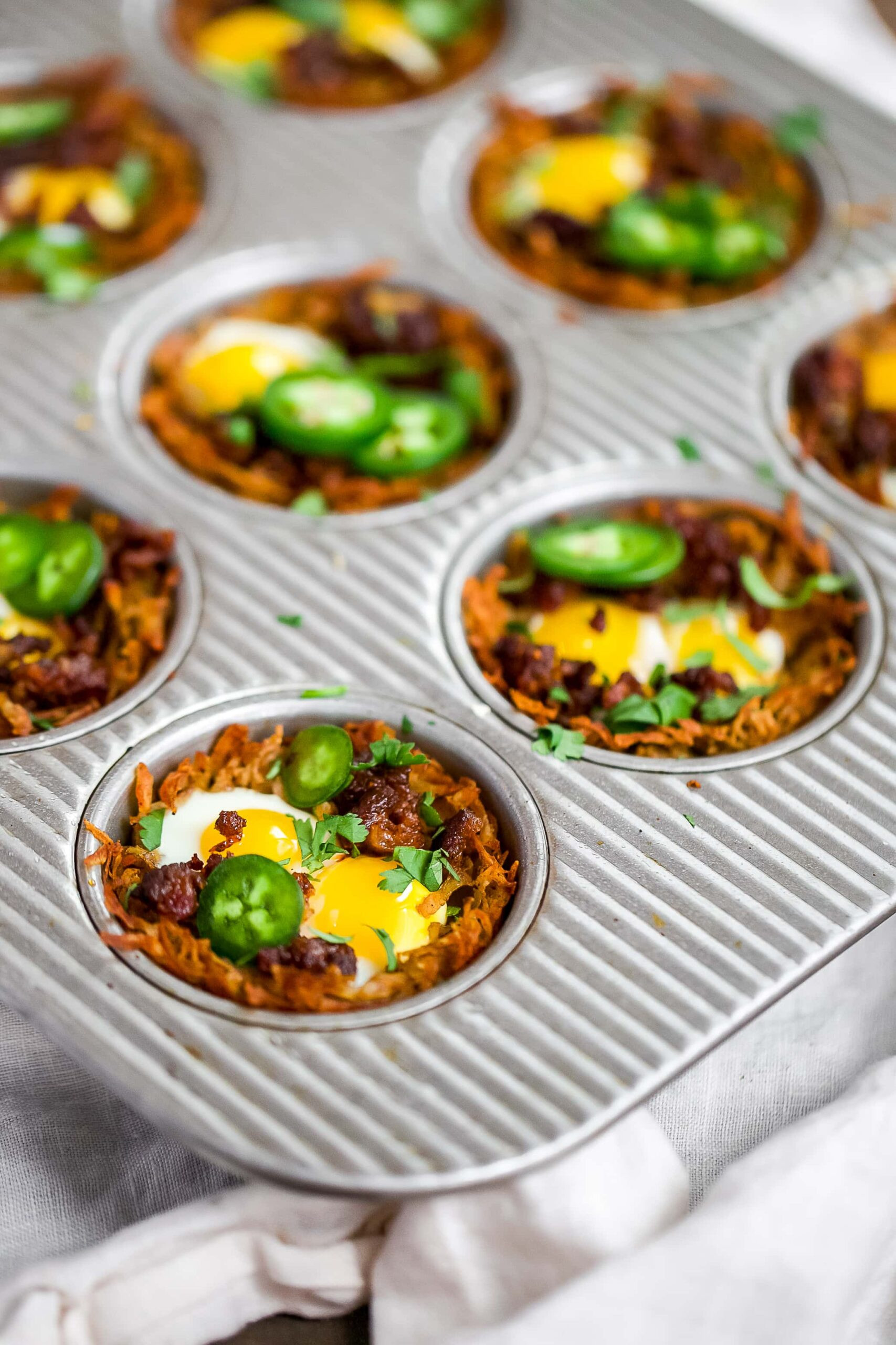 Remove the muffin tin and add more chorizo on top, followed by the sliced jalapeño and cilantro.