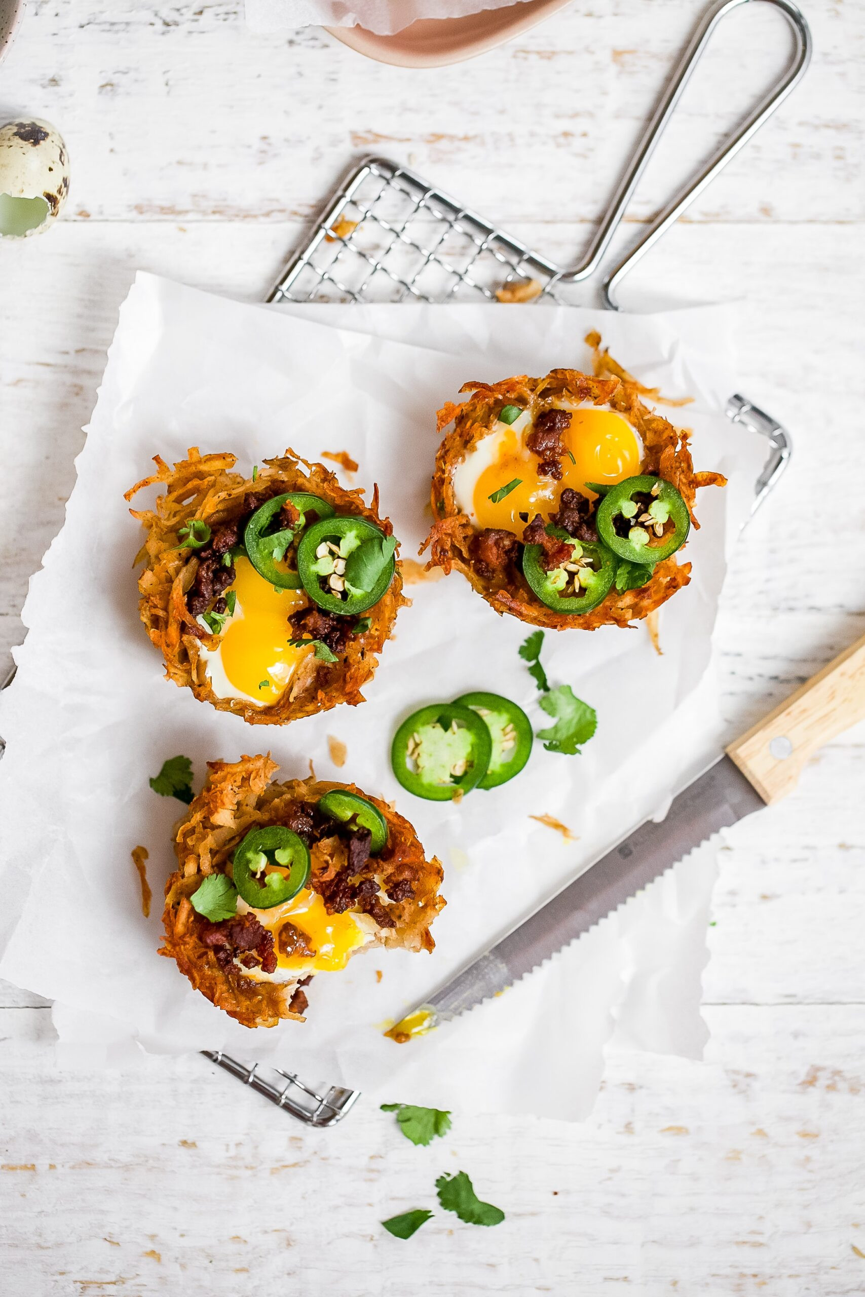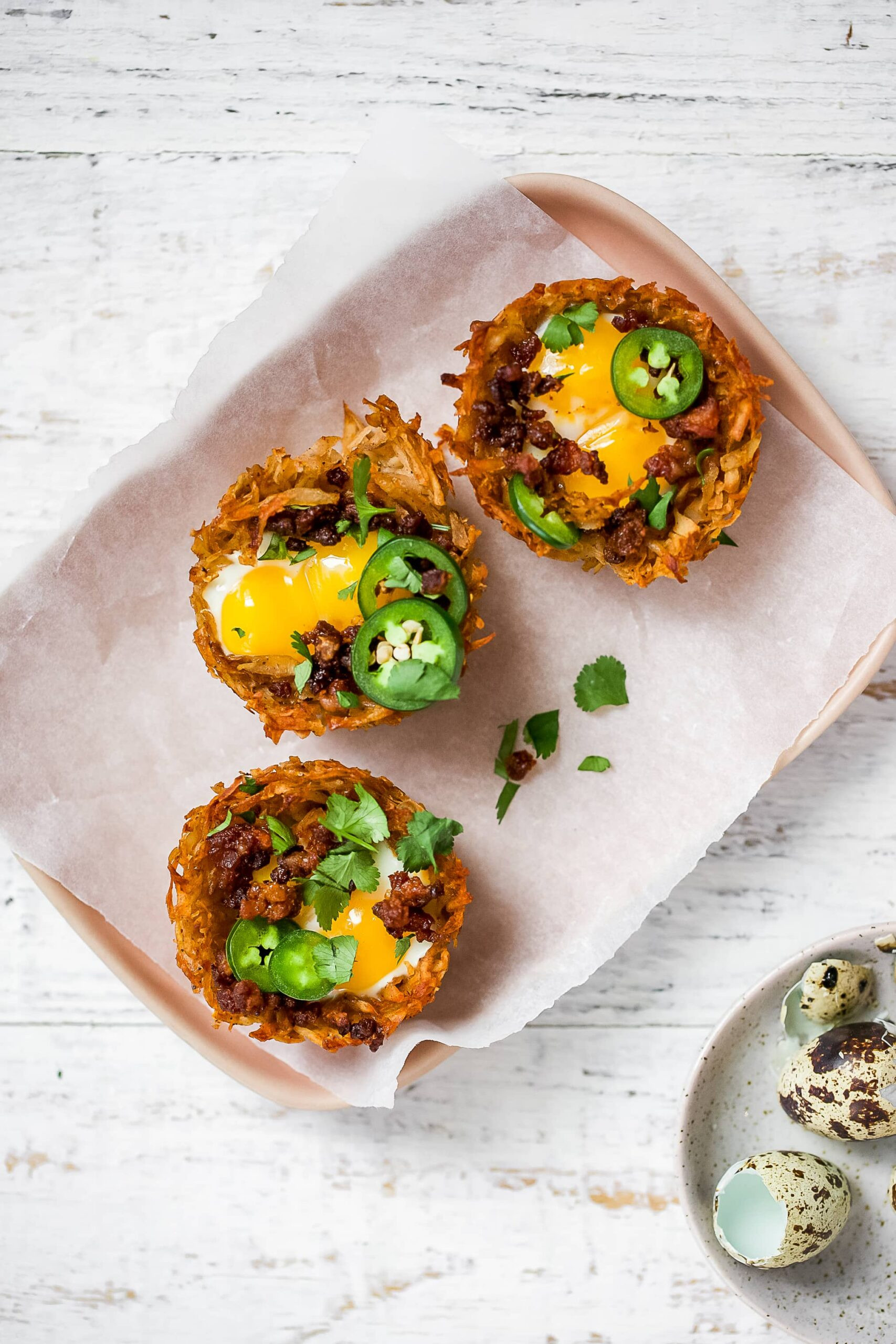 Remove the muffin tin from the oven. Add a small bit of the crumbled chorizo to the egg nests. Use a serrated knife to crack open the quail eggs and add these to the potato nests. Place back in the oven to bake for 8 to 10 minutes, until the whites are set and the yolks are still a little runny.