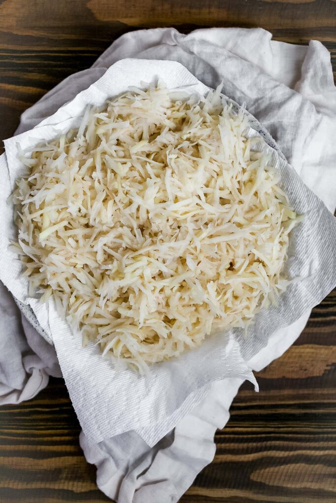 Place the shredded potatoes in a clean dish towel and drain the potato to remove the water. There is a lot of water, so be sure to really wring out the towel to get the shredded potato nice and dry.