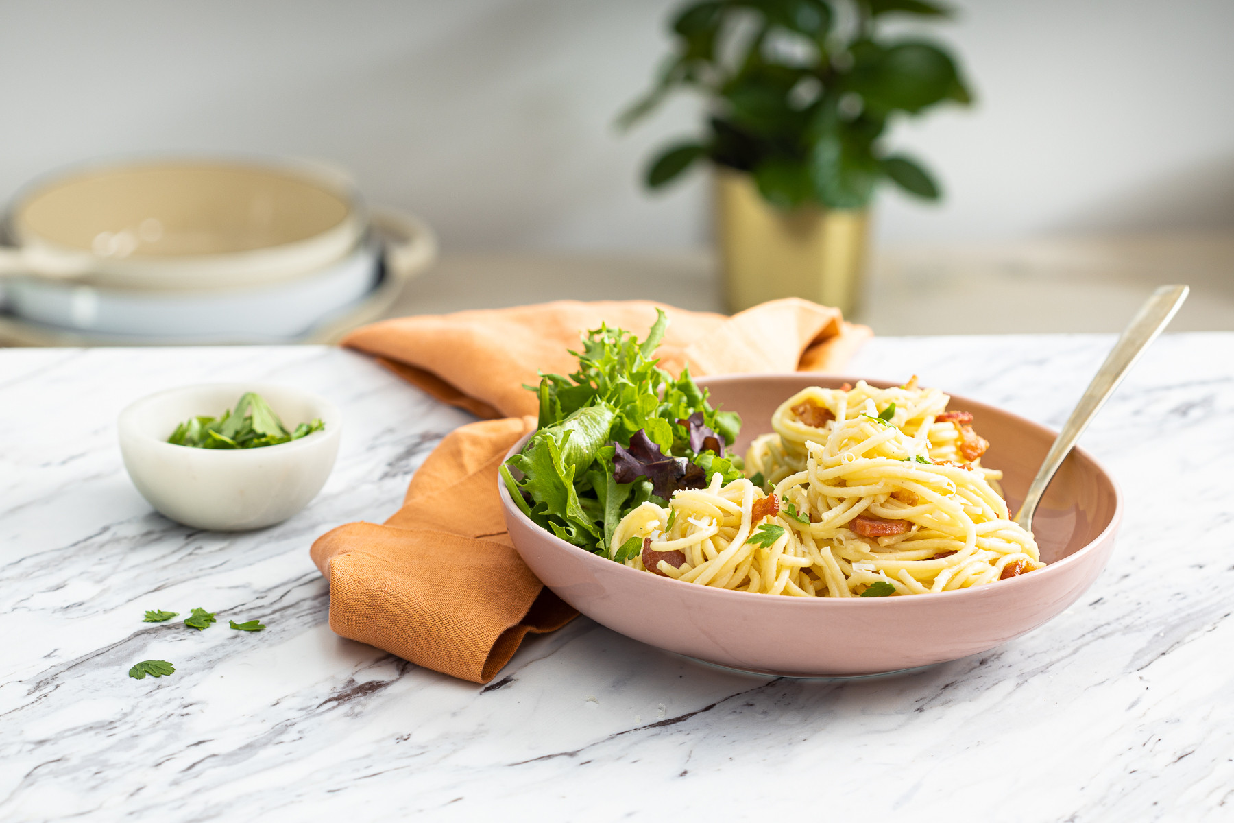 It’s like a bacon and eggs breakfast in pasta form. An enchantingly creamy texture comes courtesy of the quail eggs — perfect for lunch, dinner or parties!