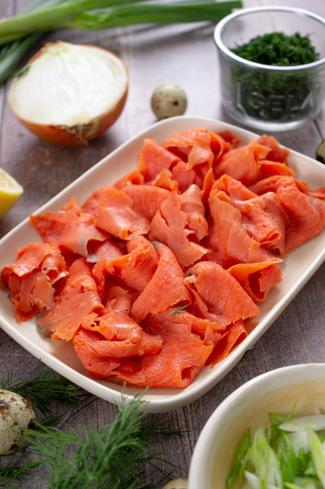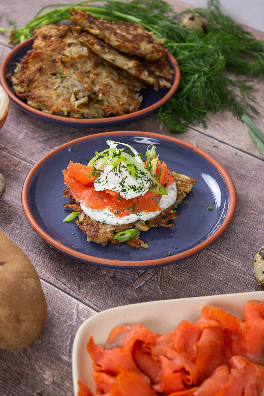 Divide latkes onto plates, top with lemon dill creme fraiche, smoked salmon and quail eggs.