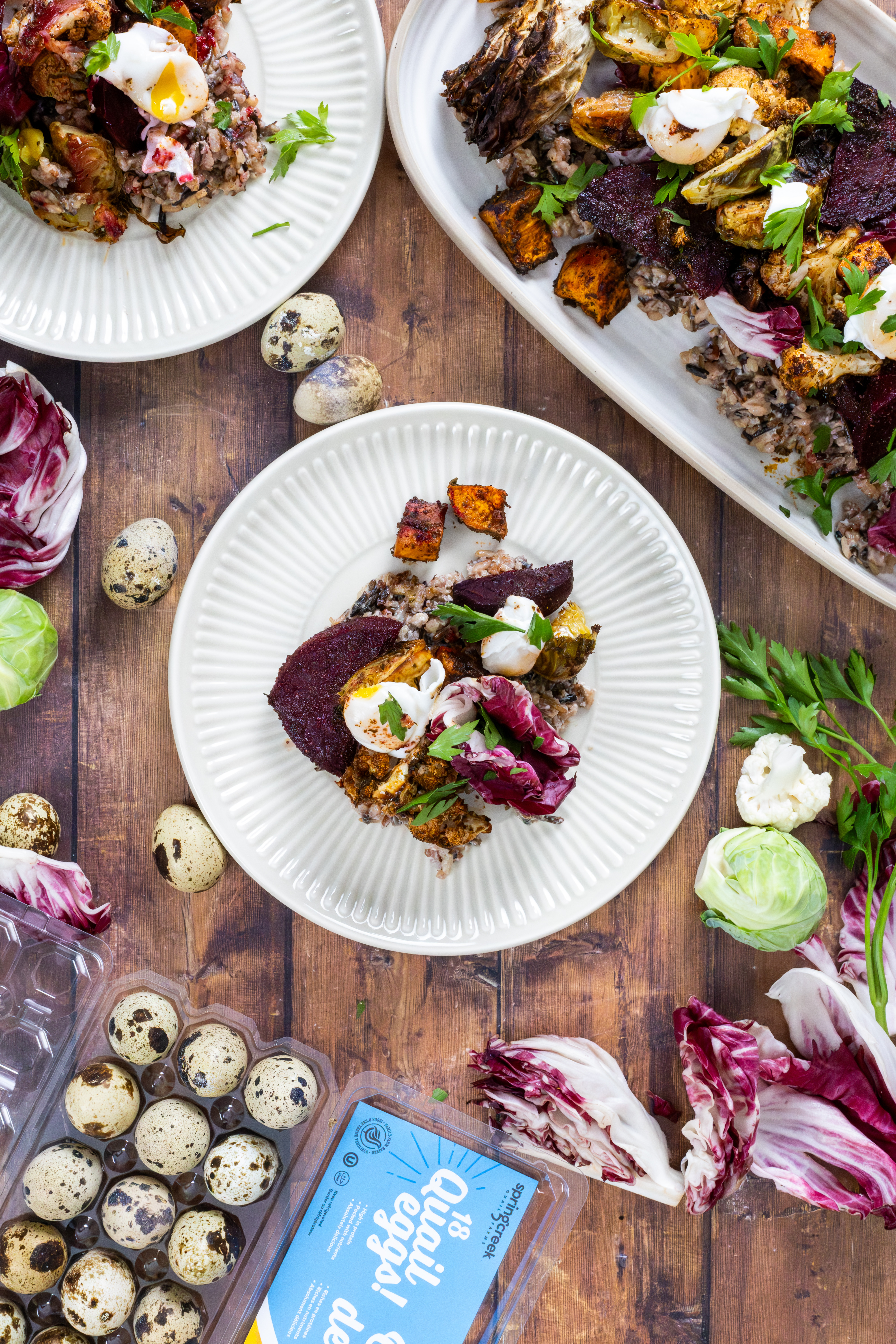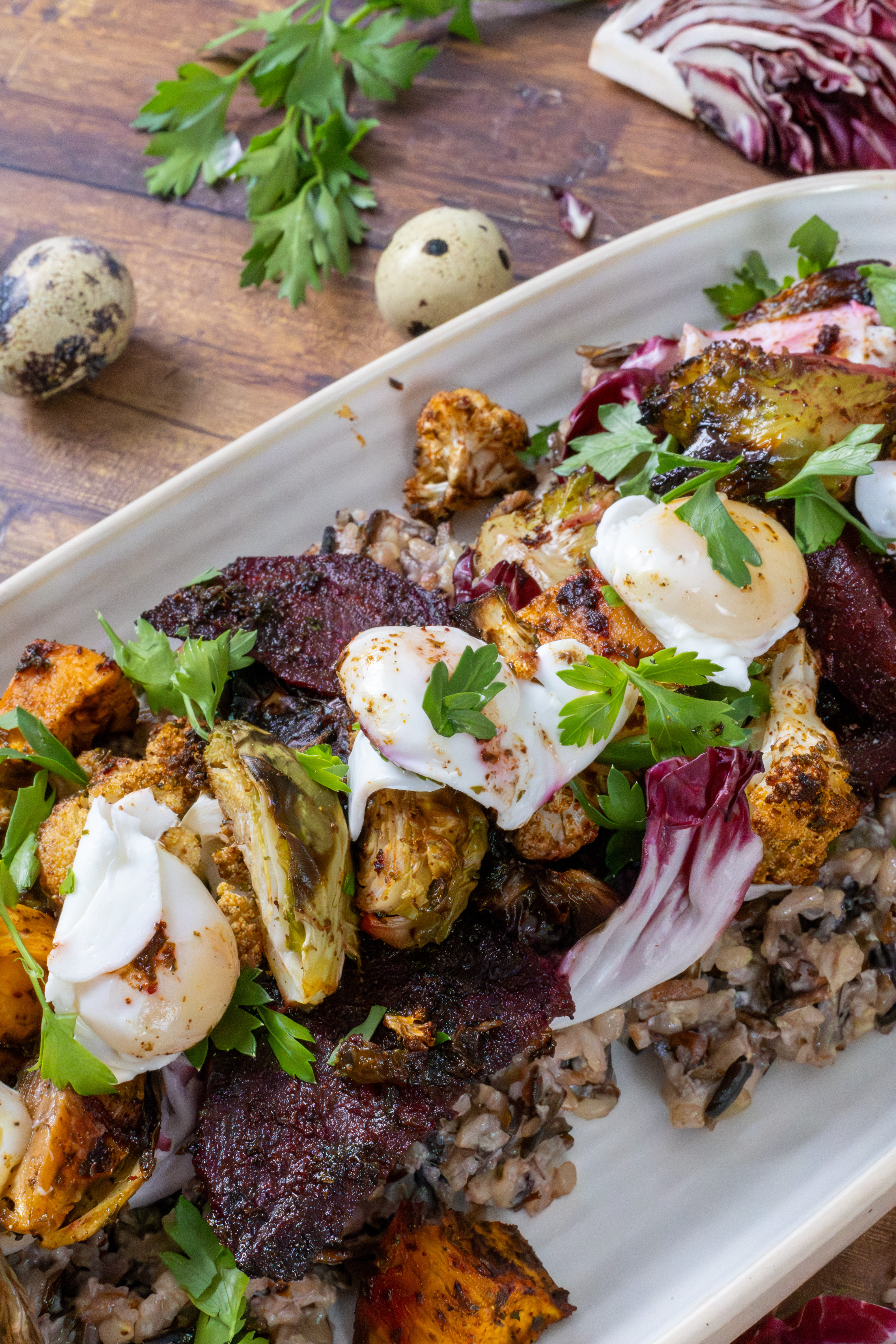 To assemble: Plate the wild rice, top with the roasted vegetables and fresh radicchio wedges. Add the poached quail eggs on top, and finish with a sprinkle of chopped parsley.